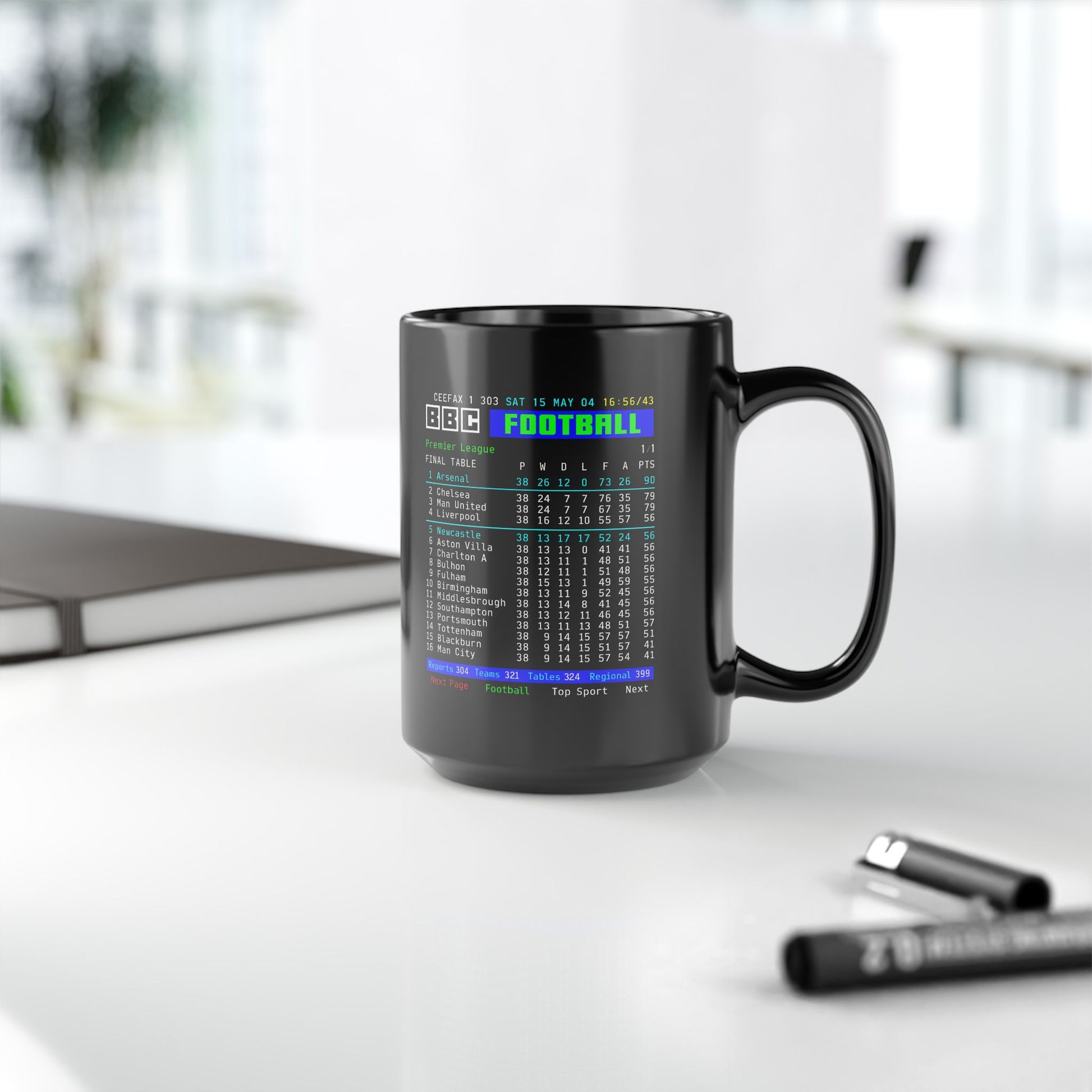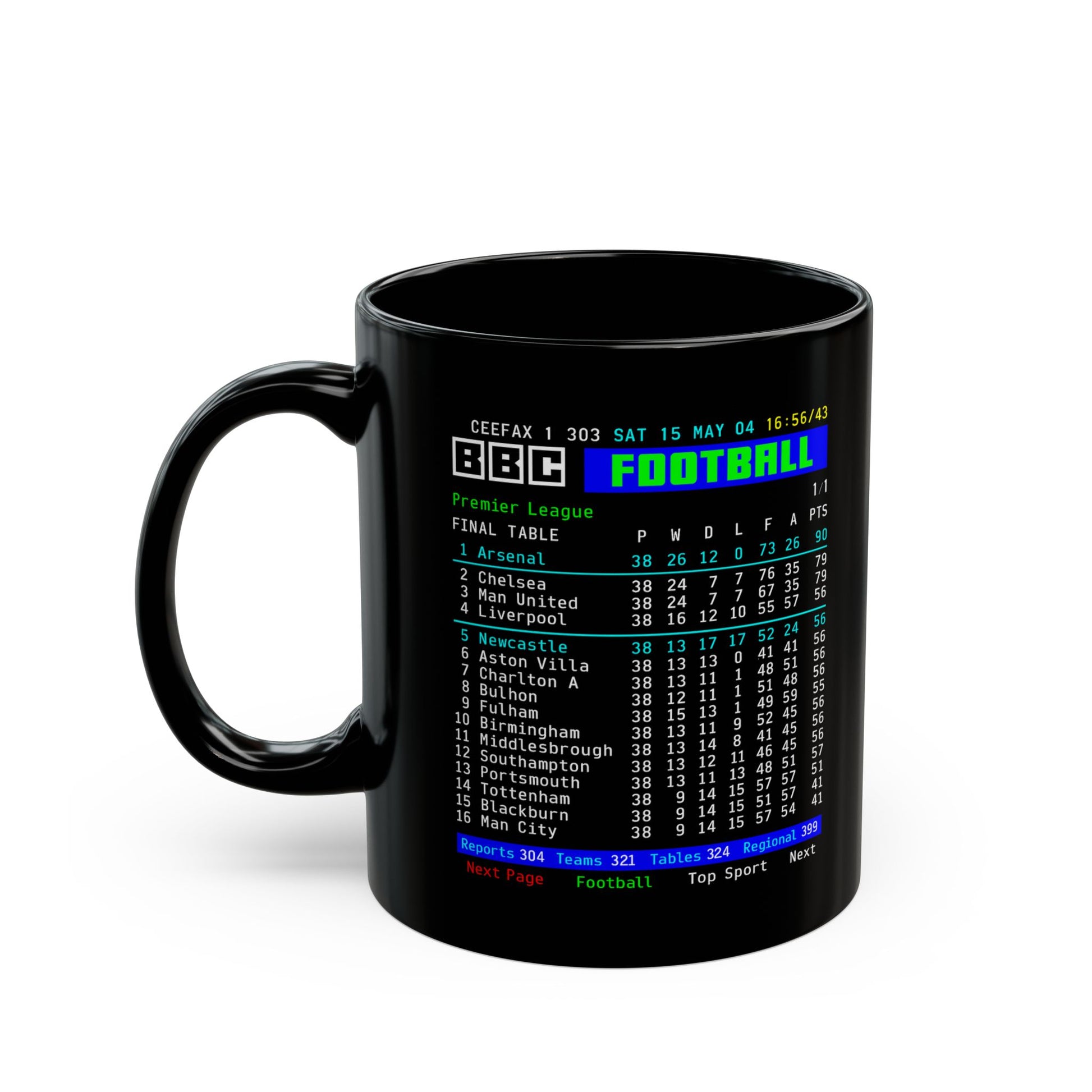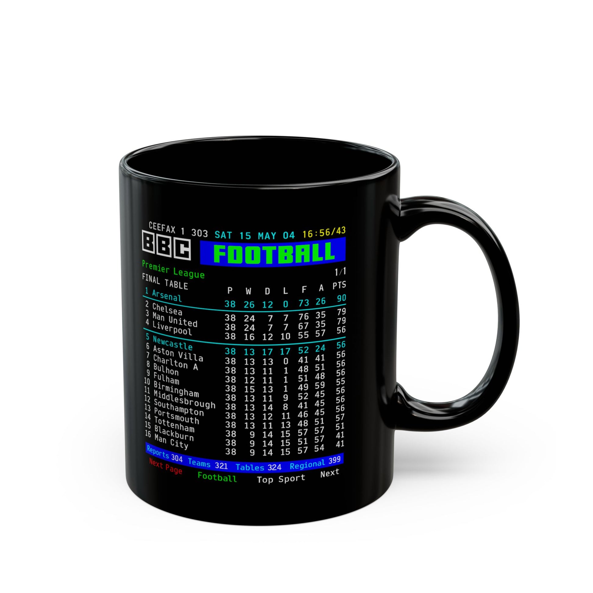 Arsenal 2004 Invincibles Premier League Table Mug — Retro BBC Teletext Style (11oz/15oz)