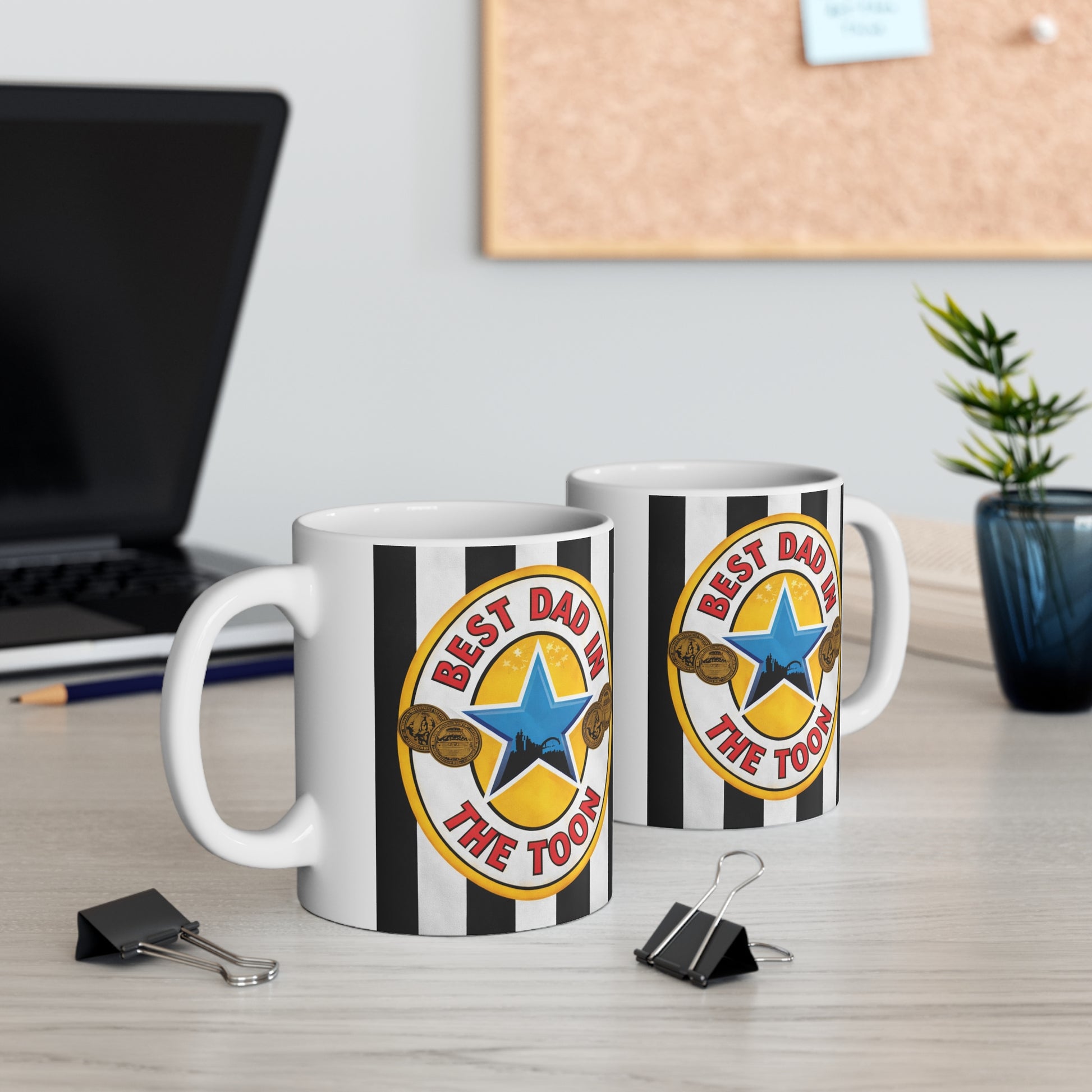 This 11 oz white ceramic mug brings a playful, hometown-pride vibe to everyday coffee and tea rituals. Bold black-and-white stripes frame a colorful badge-style graphic that reads “Best Dad in the Toon,” with a blue star and vintage rope details. It feels like a proud nod to local roots — the kind of mug a dad reaches for when he’s remembering weekend parades, local footy matches, or teaching the kids to whistle. Sturdy and bright, it holds a morning brew or an evening cocoa while looking lively on the counter or desk.